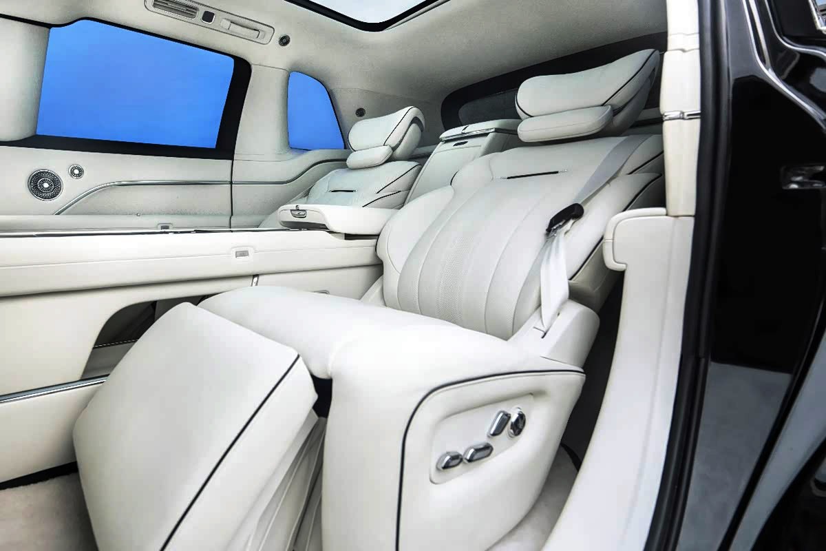 新车使用了2+2座椅布局,后排是两个沙发式的座椅,带有电动推托以及多向电动调节,两侧座椅之间是和前排中央扶手箱一体式的多功能中央地台。