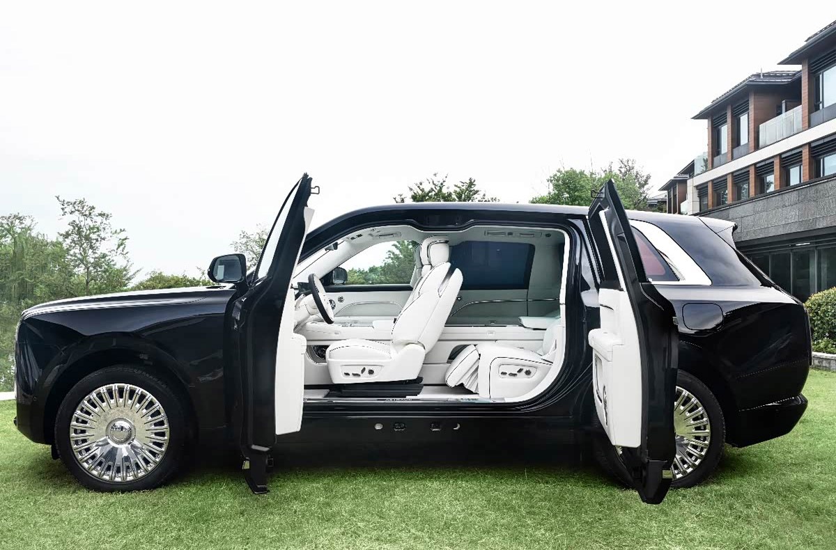 新车的外观设计风格和劳斯莱斯库里南基本一致,而且是包括很多细节造型上。前脸造型很宽厚,造型轮廓方正垂直,中网上部和下部是宽厚的镀铬装饰,内部使用了大面积的直瀑式镀铬格栅,视觉效果很霸气。大灯使用了长方形轮廓,前杠两侧带有进气风道,下部还带有黑色的横向格栅。