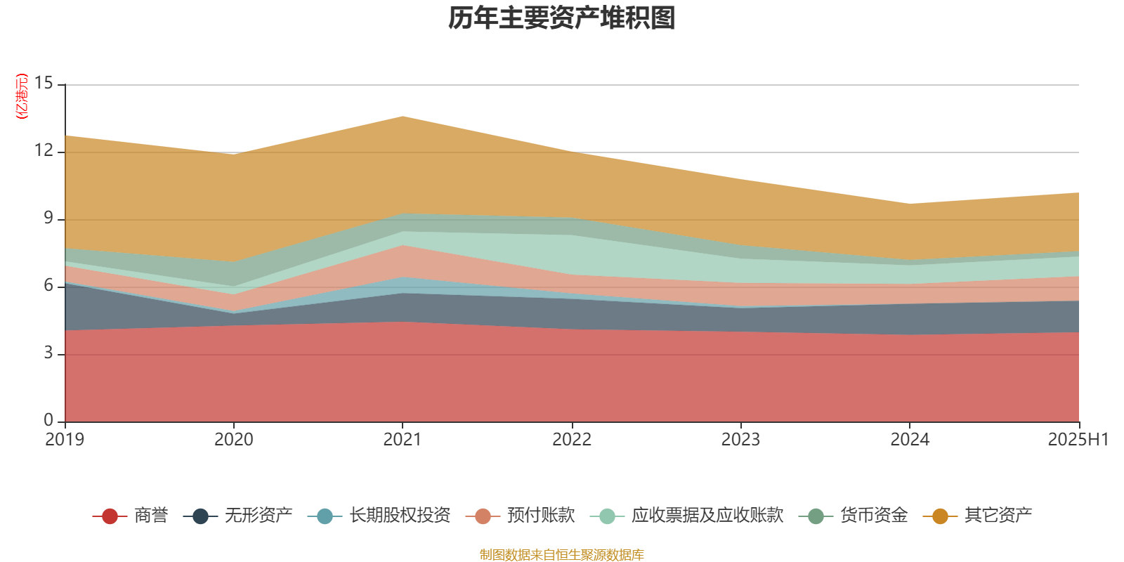 资产重大变化方面,截至2025年上半年,公司预付账款较上期末增加23.41%,占公司总资产比重上升1.58个百分点;商誉较上期末增加2.86%,占公司总资产比重下降0.88个百分点;无形资产较上期末增加1.89%,占公司总资产比重下降0.45个百分点;货币资金较上期末减少1.95%,占公司总资产比重下降0.17个百分点。